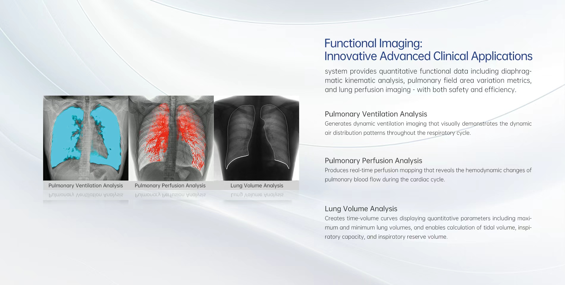 Система предоставляет количественные функциональные данные, включая анализ движения диафрагмы, показатели изменения площади легочных полей и визуализацию перфузии легких, обеспечивая как безопасность, так и эффективность.