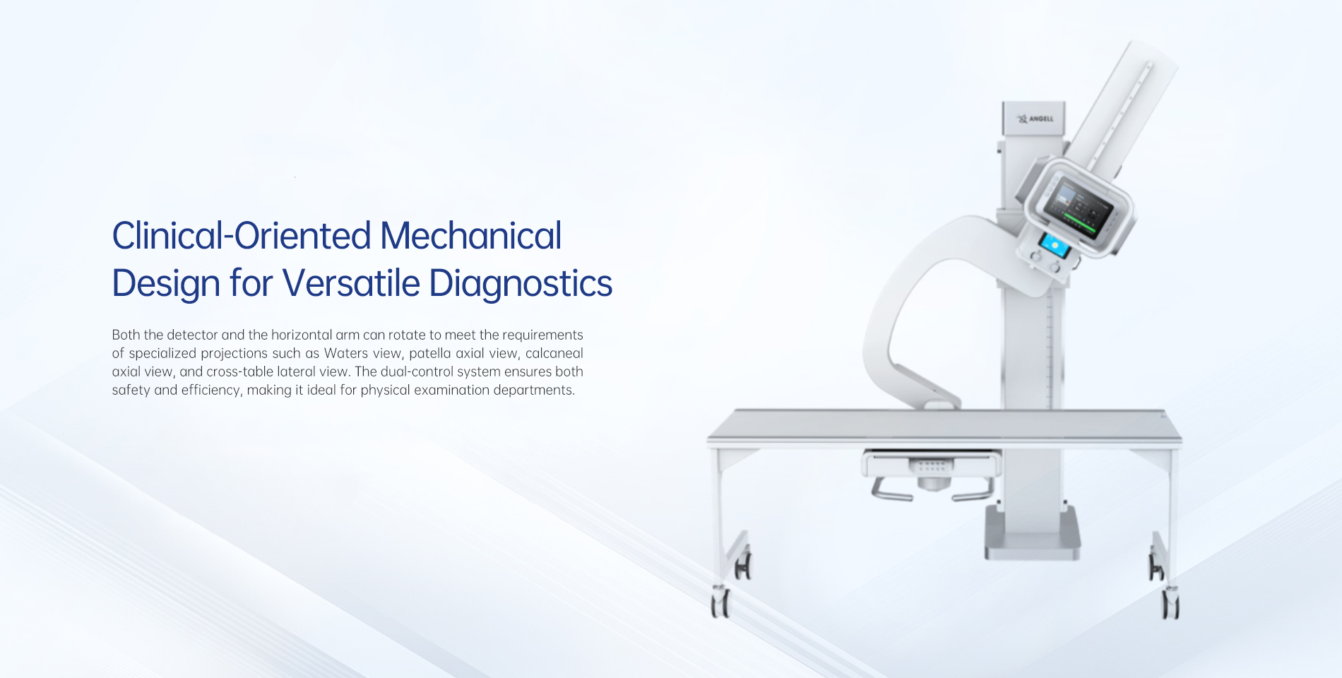 Как детектор, так и горизонтальный кронштейн могут вращаться для выполнения требований специальных проекций, таких как укладка по Уотерсу, аксиальный снимок надколенника, аксиальный снимок пяточной кости и боковая проекция поперечного стола. Двойная система управления обеспечивает безопасность и эффективность, что делает систему идеальной для отделений профилактических осмотров.