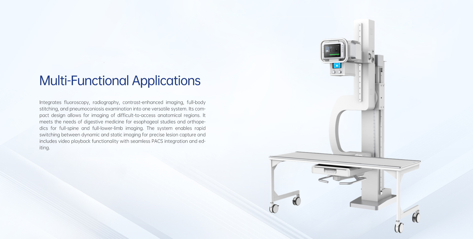 Объединяет флюороскопию, рентгенографию, контрастные исследования, панорамное сканирование всего тела и обследование на пневмокониоз в одну универсальную систему. Ее компактный дизайн позволяет визуализировать труднодоступные анатомические области. Она удовлетворяет потребности гастроэнтерологии в исследованиях пищевода и ортопедии в визуализации всего позвоночника и нижних конечностей. Система обеспечивает быстрое переключение между динамической и статической визуализацией для точного захвата патологических очагов и включает функцию воспроизведения видео с возможностью seamless-интеграции с PACS и редактирования.